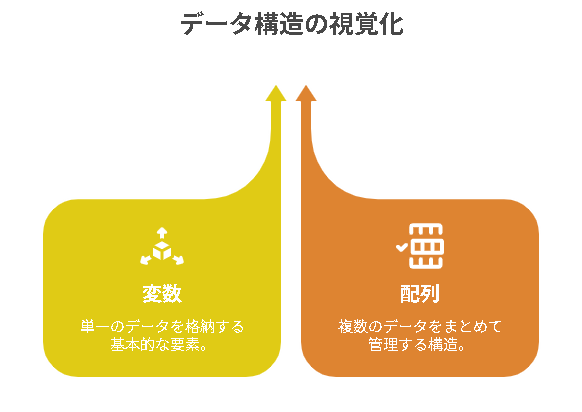 - インデックス:配列内のデータの位置を表す番号。通常は0から始まります。