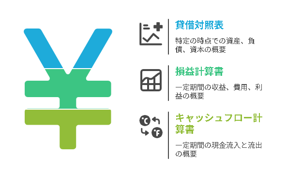 | 貸借対照表(B/S) | 企業のある時点での資産・負債・純資産の状態を示す | 企業の財政状態を把握できる |