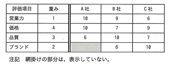 A社は競合する他社とのポジショニングの分析を行った。3社の中でA社が最高の評価を得るには、A社のブランドの評価項目は、最低何ポイントが必要か。 なお、各評価項目の最低値は1ポイント,最高値は10ポイントとし、それぞれの評価項目の重み付けをした合計値で各社の評価を行うものとする。