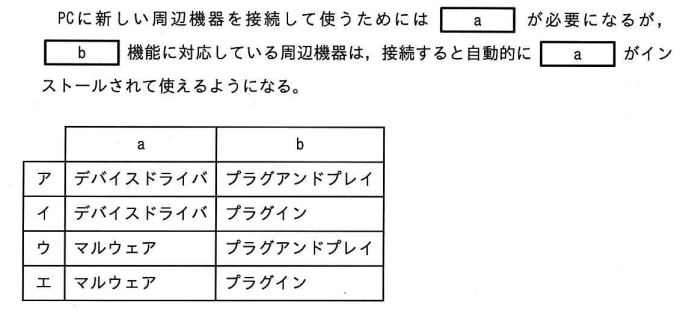 正解は「ア」です。PCに新しい周辺機器を接続して使うためには、その周辺機器をPCが認識し、正しく動作させるための「デバイスドライバ」が必要です。デバイスドライバは、PCのOS(オペレーティングシステム)と周辺機器の間で通訳のような役割を果たし、それぞれの情報をやり取りできるようにします。しかし、最近の多くの周辺機器は「プラグアンドプレイ」という機能に対応しています。これは、PCに接続するだけで、OSが自動的に適切なデバイスドライバを探してインストールしてくれる便利な機能のことです。