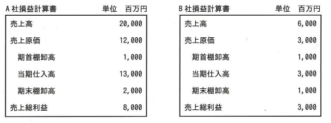 A社の子会社であるB社では、A社の製品も販売している。A社とB社の当期の売上高,売上原価,売上総利益が表のとおりであり,当期のA社の売上高におけるB社への販売分が2,000百万円である。このとき、連結損益計算書における当期仕入高は何百万円か。ここで、A社はB社からの仕入はないものとする。