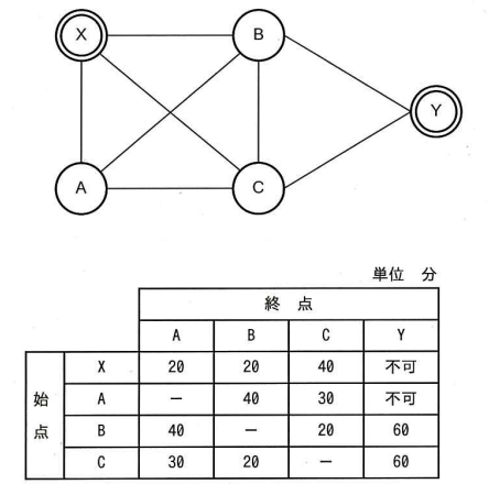 地点Xから出発してA, B, Cの3地点の全てを経由して地点Yまで行きたい。各地点間の経路と所要時間が図及び表のとおりであるとき、地点Xから地点Yまで行く最短の時間は何分か。ここで、3地点A, B, Cはどのような順番で経由してもよいものとする。