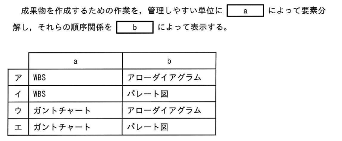 プロジェクトで実施する作業の順序設定に関して,次の記述中のa, bに入れる字句の適切な組合せはどれか。