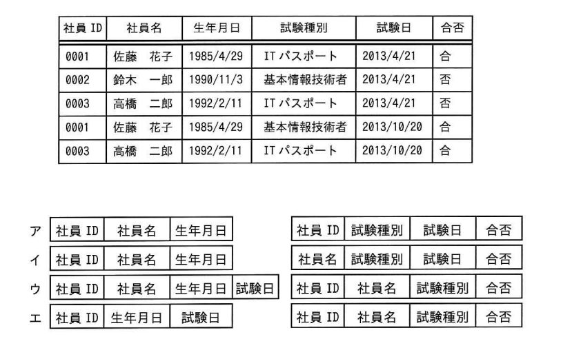 ウ(社員ID,社員名,生年月日,試験日 と 社員ID,社員名,試験種別,合否):