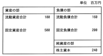- 総資本(資産の部合計):流動資産合計(100百万円) + 固定資産合計(500百万円) = 600百万円