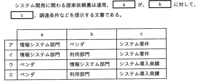 したがって、a(提案依頼書を発行する側)は「情報システム部門」、b(提案依頼書を受け取り、提案を行う側)は「ベンダ」、c(提示される主な内容)は「システム要件」となり、組合せとして適切なのは「ア」となります。 例えるなら、家を建てたい施主(情報システム部門)が、工務店(ベンダ)に「どんな家にしたいか」(システム要件)を伝えて、見積もり(提案)を求める文書がRFPです。