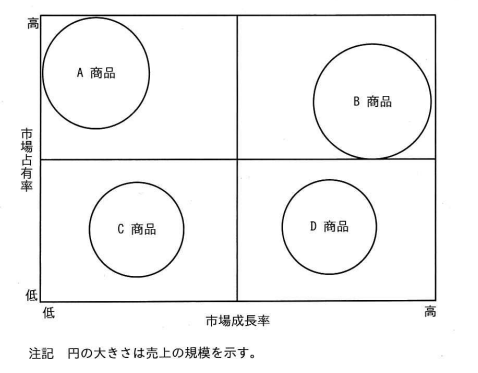 自社の新商品について PPM を作図した。「金のなる木」に該当するものはどれか。