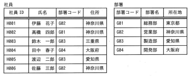 - 高橋四郎 (H002): 住所「神奈川県」、部署コード「G01」です。「部署」表を見ると、G01の所在地は「東京都」です。社員の住所と部署の所在地が異なります(神奈川県 ≠ 東京都)。この社員は条件に当てはまります。