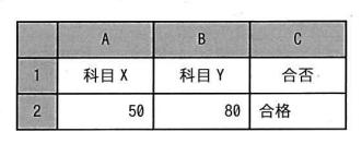 表計算ソフトを用いて、二つの科目X, Yの成績を評価して合否を判定します。それぞれの点数はワークシートのセルA2, B2に入力します。合計点が120点以上であり、かつ、2科目とも50点以上であればセルC2に「合格」、それ以外は「不合格」と表示します。セルC2に入れる適切な計算式はどれか。