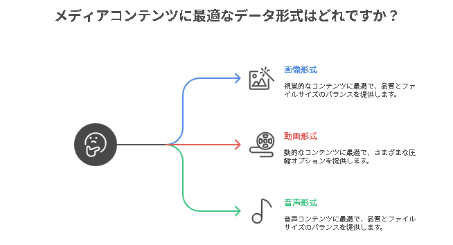マルチメディアコンテンツを扱う上で重要なのは、データ形式(フォーマット)の違いを理解することです。下記の表に代表的な画像・音声・動画形式をまとめます。