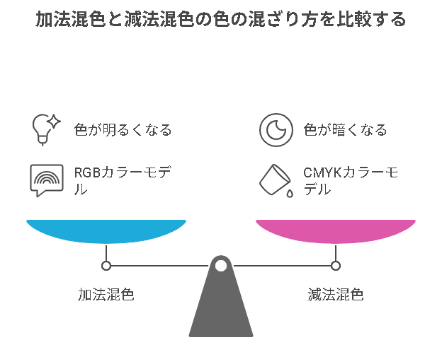 色の表現方法として「加法混色(RGB)」と「減法混色(CMYK)」があります。加法混色は光の三原色(赤・緑・青)を混ぜて白に近づけ、ディスプレイなどの発光デバイスで使われます。減法混色は色の三原色(シアン・マゼンタ・イエロー)を混ぜて黒に近づけ、印刷物で利用されます。