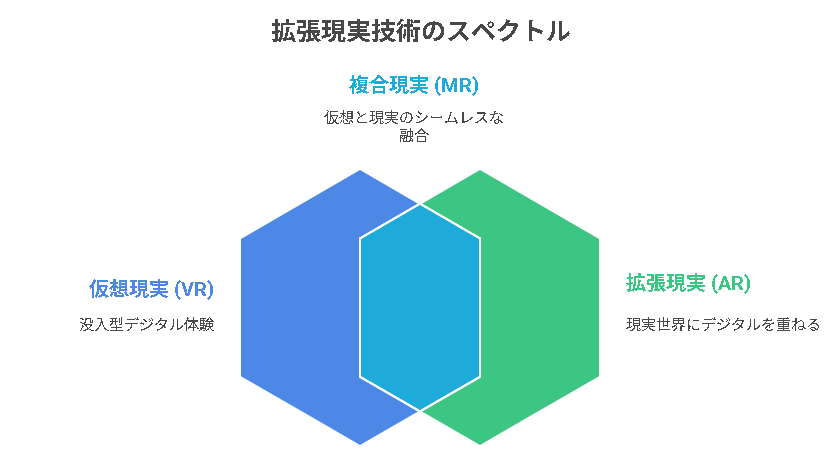 - MR(複合現実):現実と仮想の情報が相互作用する技術。例:Microsoft HoloLens。