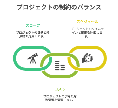 プロジェクトを進める際には「スコープ(範囲)」「コスト(費用)」「スケジュール(期間)」の3つの要素が強く関連し合います。この3つは「プロジェクトの三大制約」と呼ばれ、どれか一つに変化が生じると他に影響を与えます。