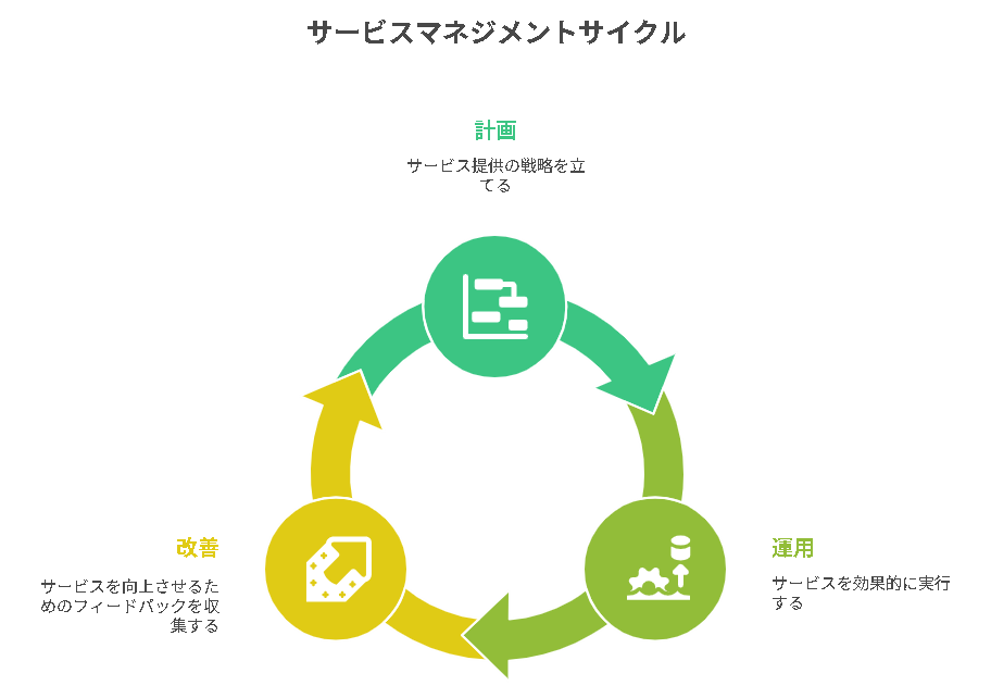 ITパスポート試験における「サービスマネジメント」とは、ITサービスの提供を通じて顧客満足度を最大化し、ビジネス価値を創出するための組織的な管理活動を指します。単にサービスを提供するだけでなく、計画・設計・運用・改善を継続的に行うことが求められます。