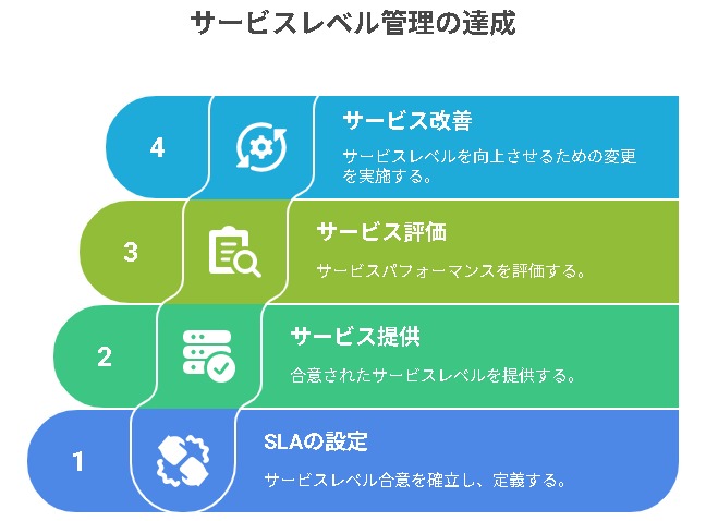 サービスレベル管理はサービスの品質を保つための管理手法であり、SLAはその管理内容を文書化したものです。SLAを通じて顧客とサービス提供者の期待を明確にし、サービスの達成基準を設定します。