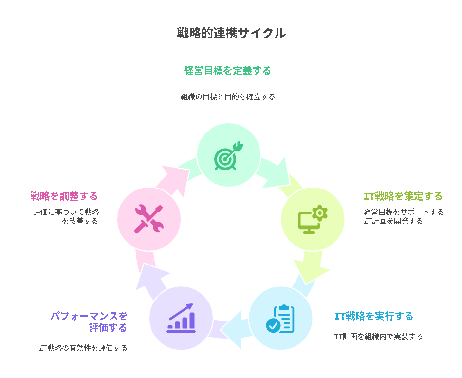 このように両者が連携しないと、IT投資が無駄になったり、企業の競争力を損なったりするリスクが高まります。したがって、戦略的アライメント(戦略の整合性)を維持することが極めて重要です。実際には、経営陣とIT部門が連携してロードマップを作成し、IT導入計画を中長期的に管理します。