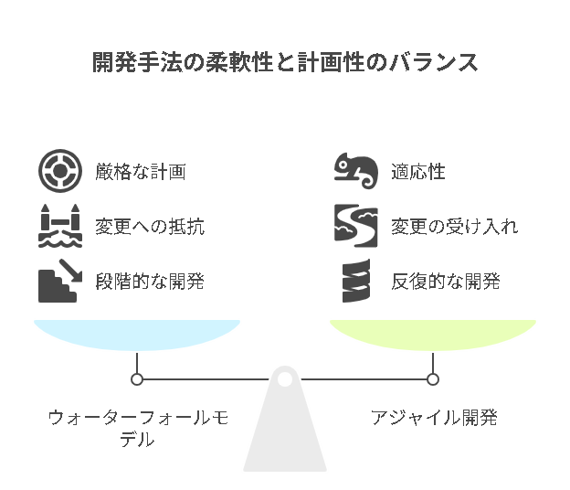• アジャイル開発:反復的に開発を行い、柔軟に仕様変更に対応する手法。顧客との連携が密です。